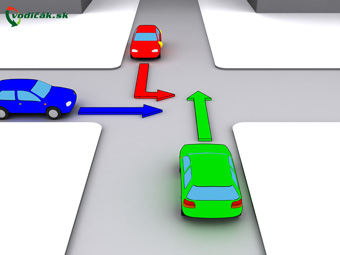 červeného vozidla, pretože prichádza na križovatku sprava.