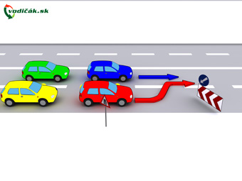 nesmie ohroziť vodiča červeného vozidla jazdiaceho v priebežnom jazdnom pruhu, do ktorého prechádza