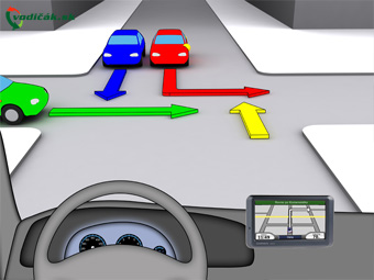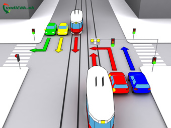 vodič červeného vozidla odbočujúceho vľavo je povinný dať prednosť protiidúcemu zelenému a žltému vozidlu a obidvom električkám,
